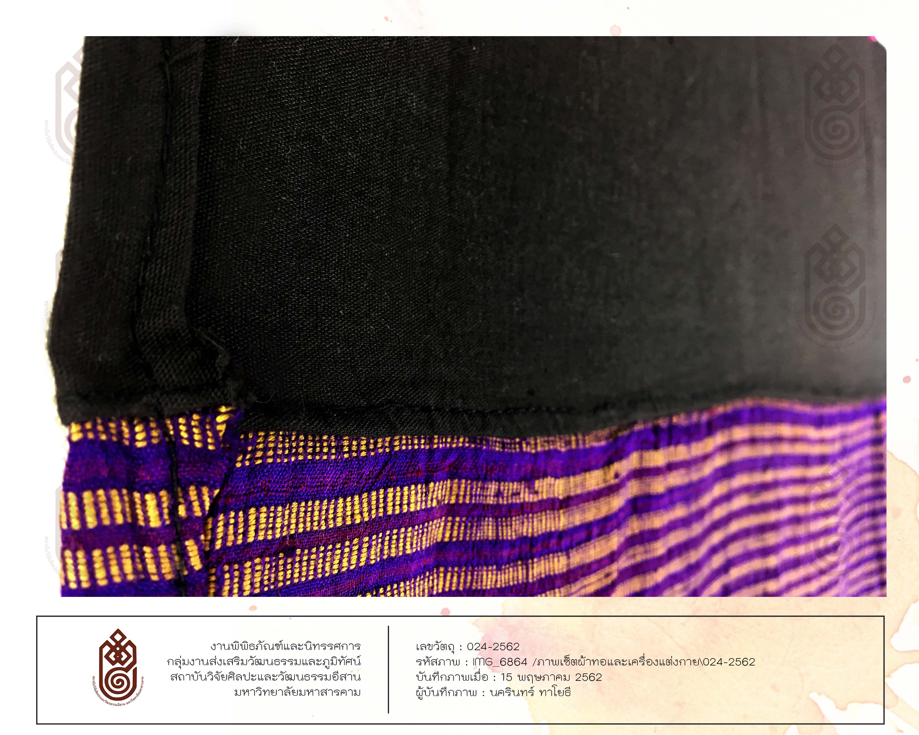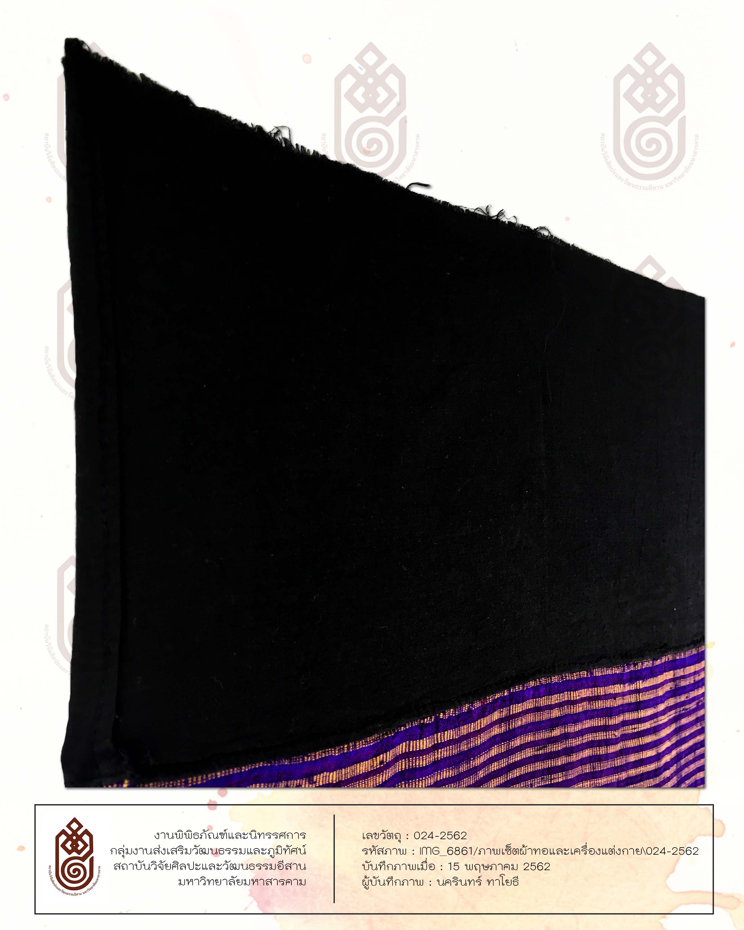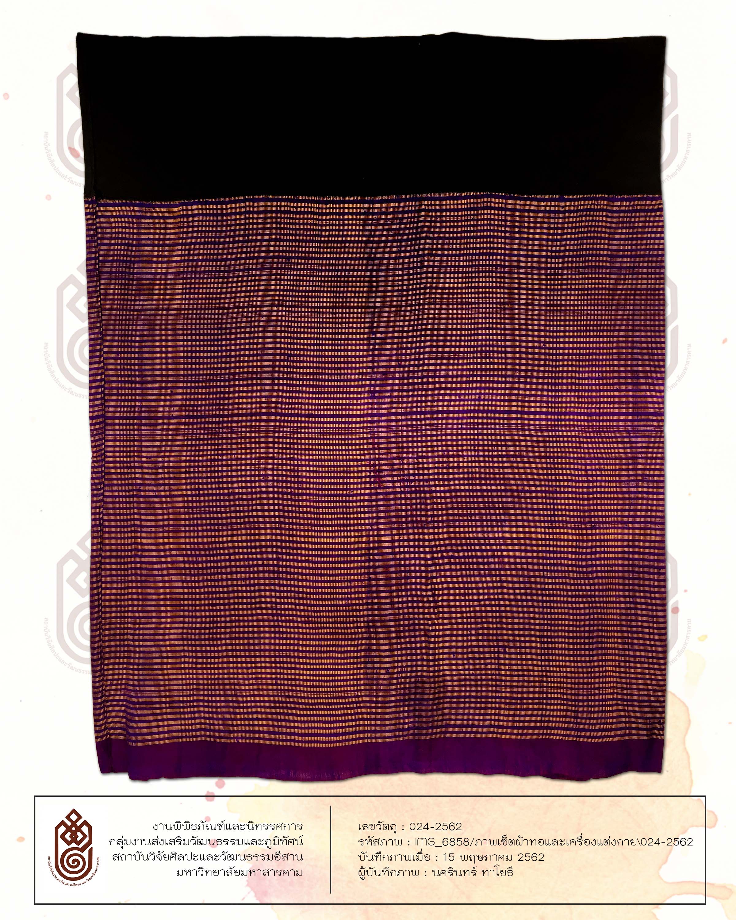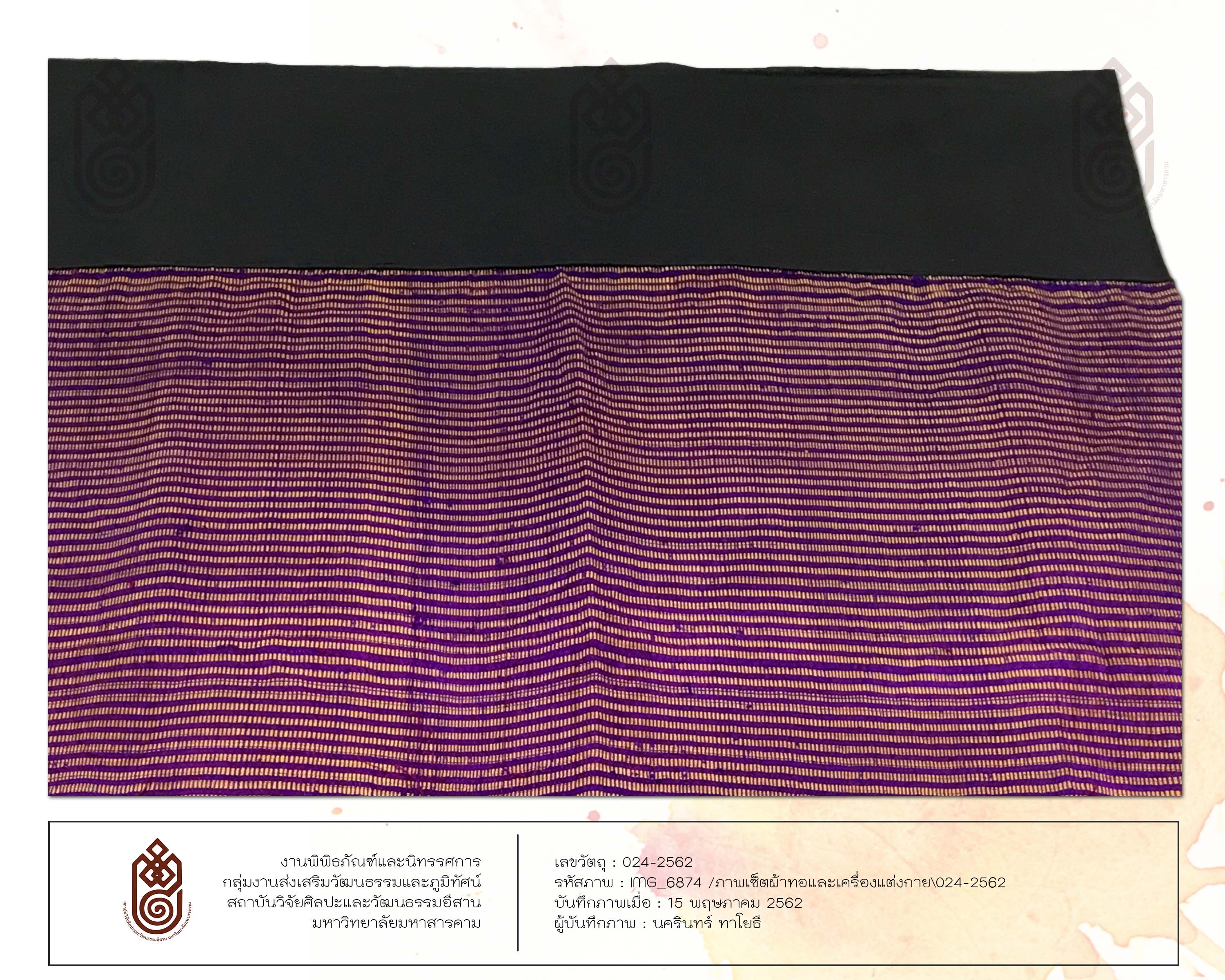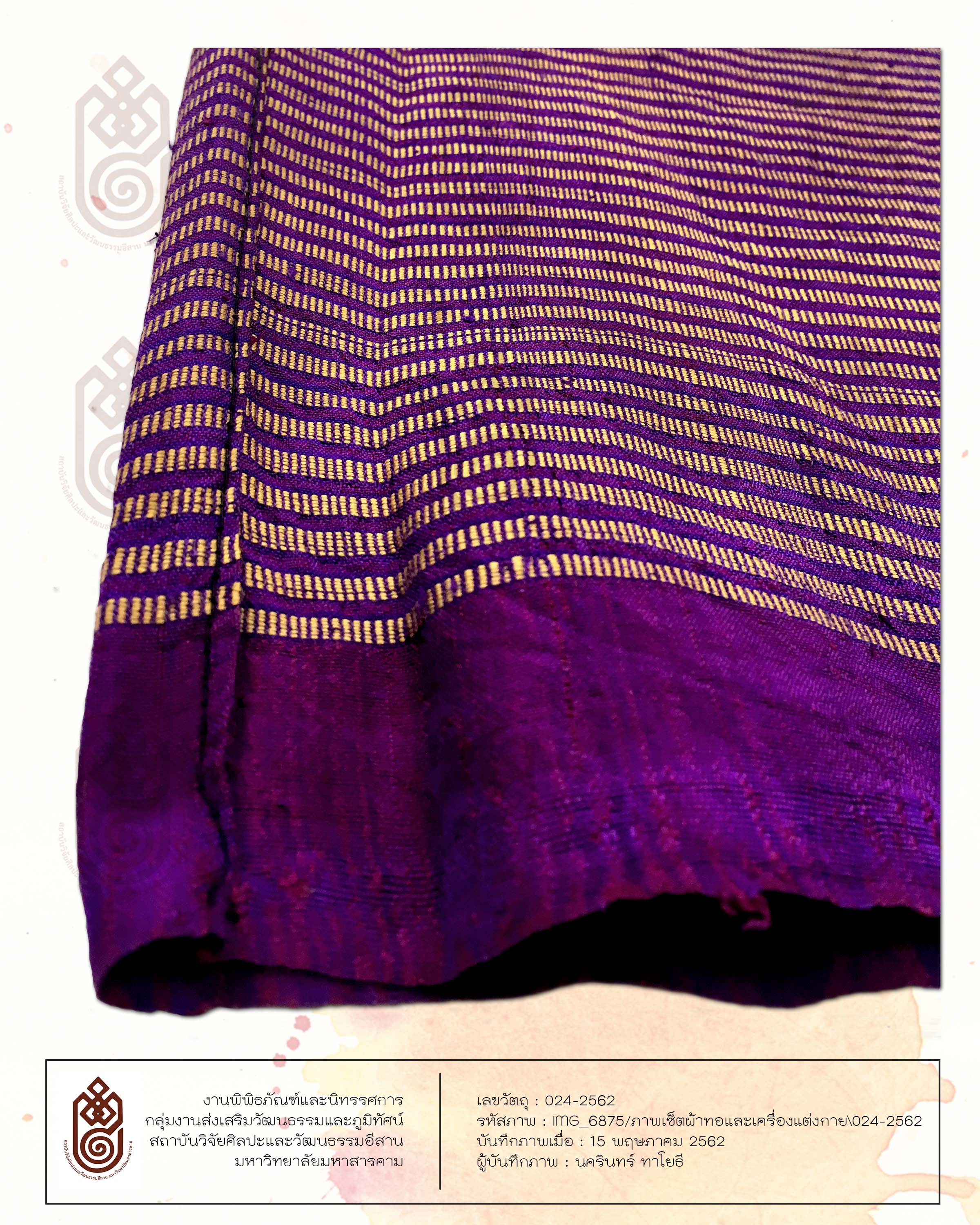 ลักษณะรูปร่างสี่เหลี่ยมผืนผ้า ทอด้วยเส้นไหมน้อย มีการเย็บเป็นผ้าซิ่น มีการต่อหัวเข้ากับตัวซิ่น หัวซิ่นเป็นลายคั่น สีม่วง สีชมพู ตัวซิ่นเป็นการทอสลับเส้นยืนทำให้เกิดเป็นลวดลาย สีพื้นของผ้าคือสีม่วง