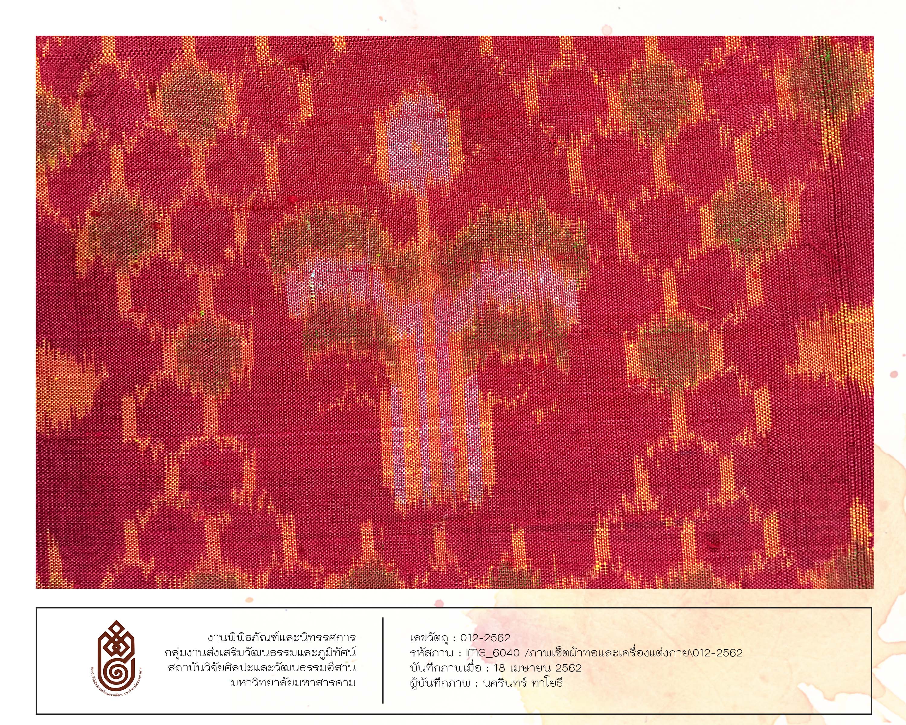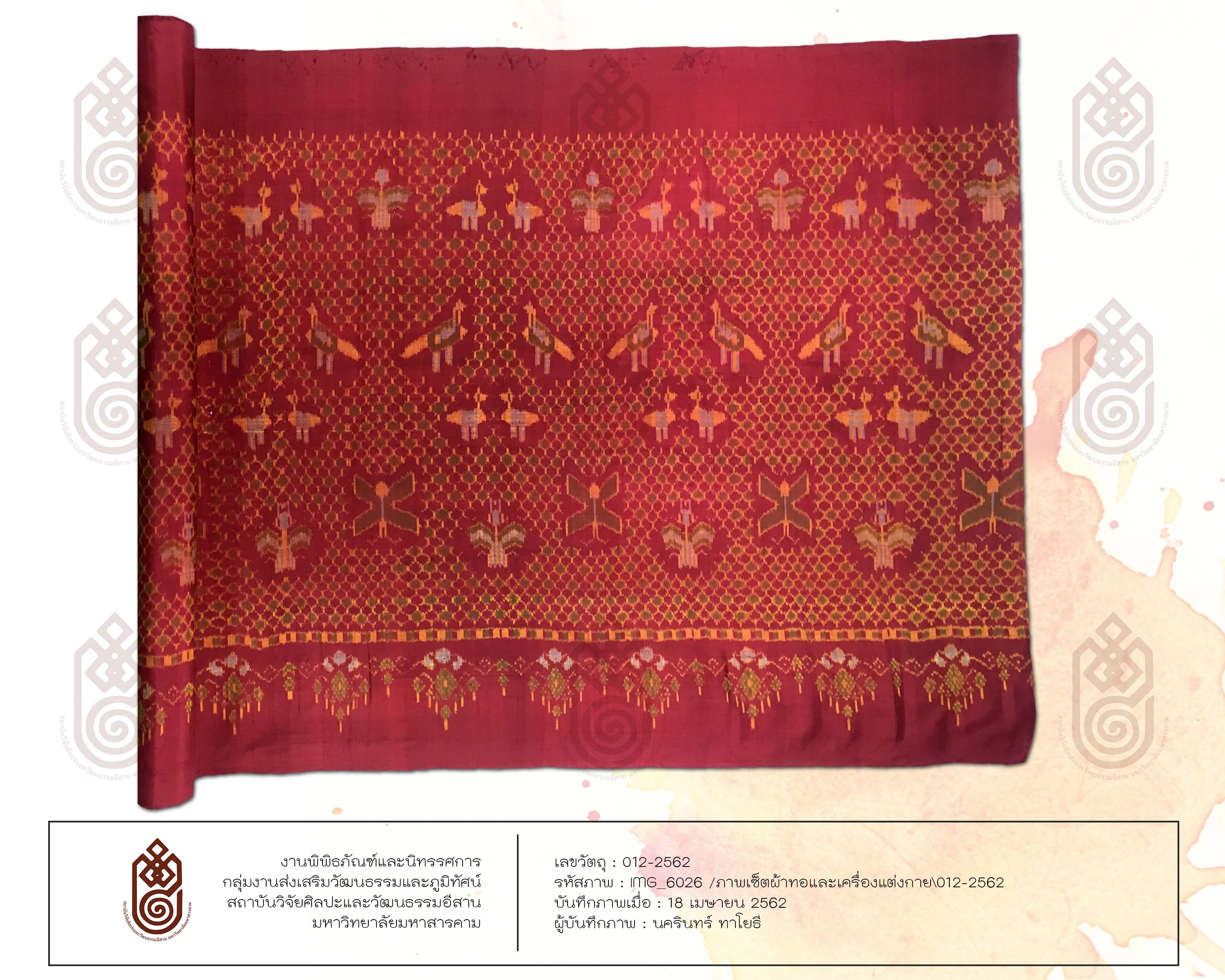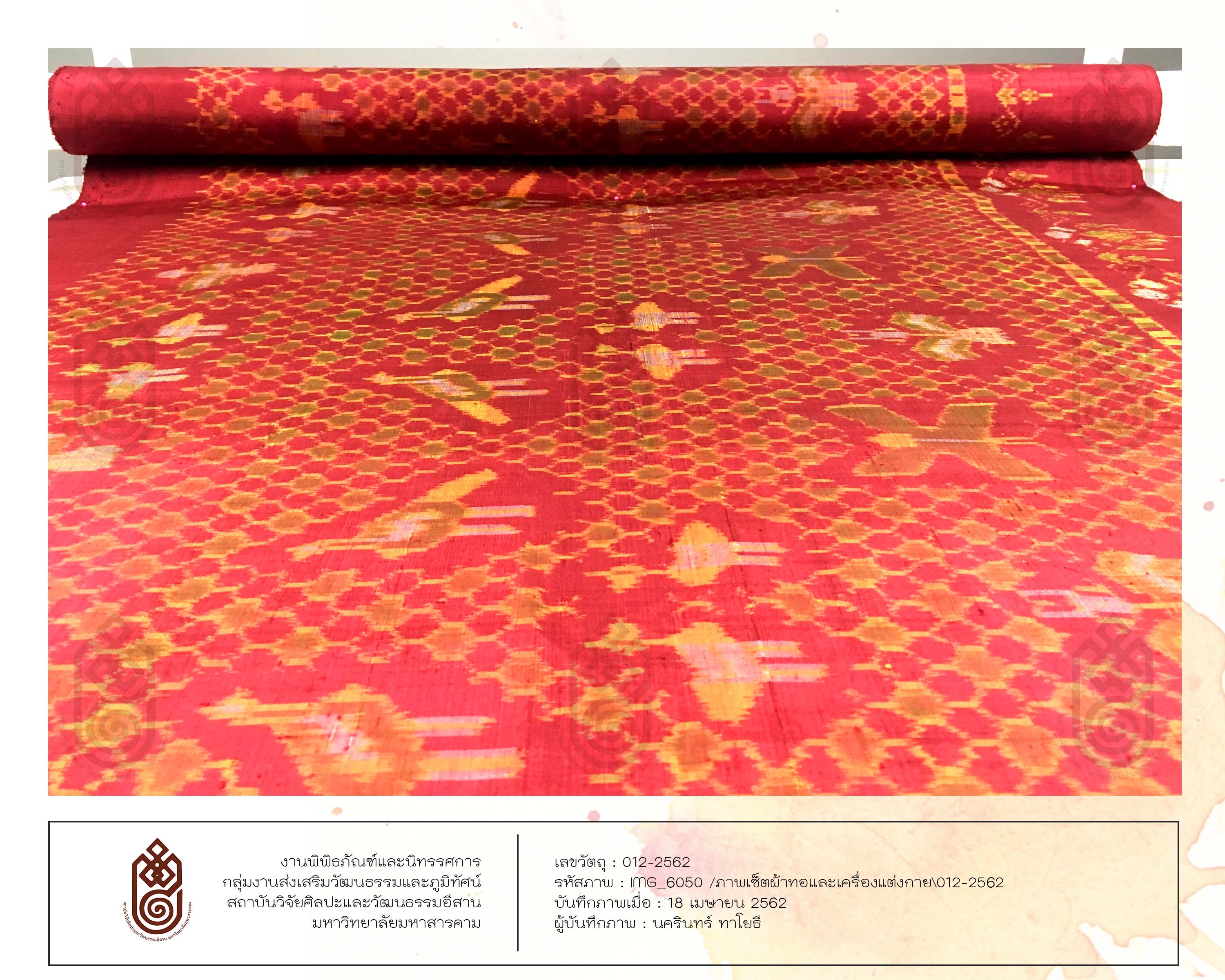 ลักษณะรูปร่างสี่เหลี่ยมผืนผ้า เป็นผ้าทอผืนยาวผืนเดียว เทคนิคที่ใช้ในการทอคือการมัดหมี่ทำให้เกิดลวดลาย สีพื้นของผ้าคือสีแดงย้อมจากสีเคมี ลวดลายประกอบด้วยลายประยุกต์ขึ้นมาจากจินตนาการของช่างผู้ทอ เป็นรูปนกสีเขียว สีเหลือง สีฟ้า สลับกับลายเกล็ดปลาสีเขียว สีเ