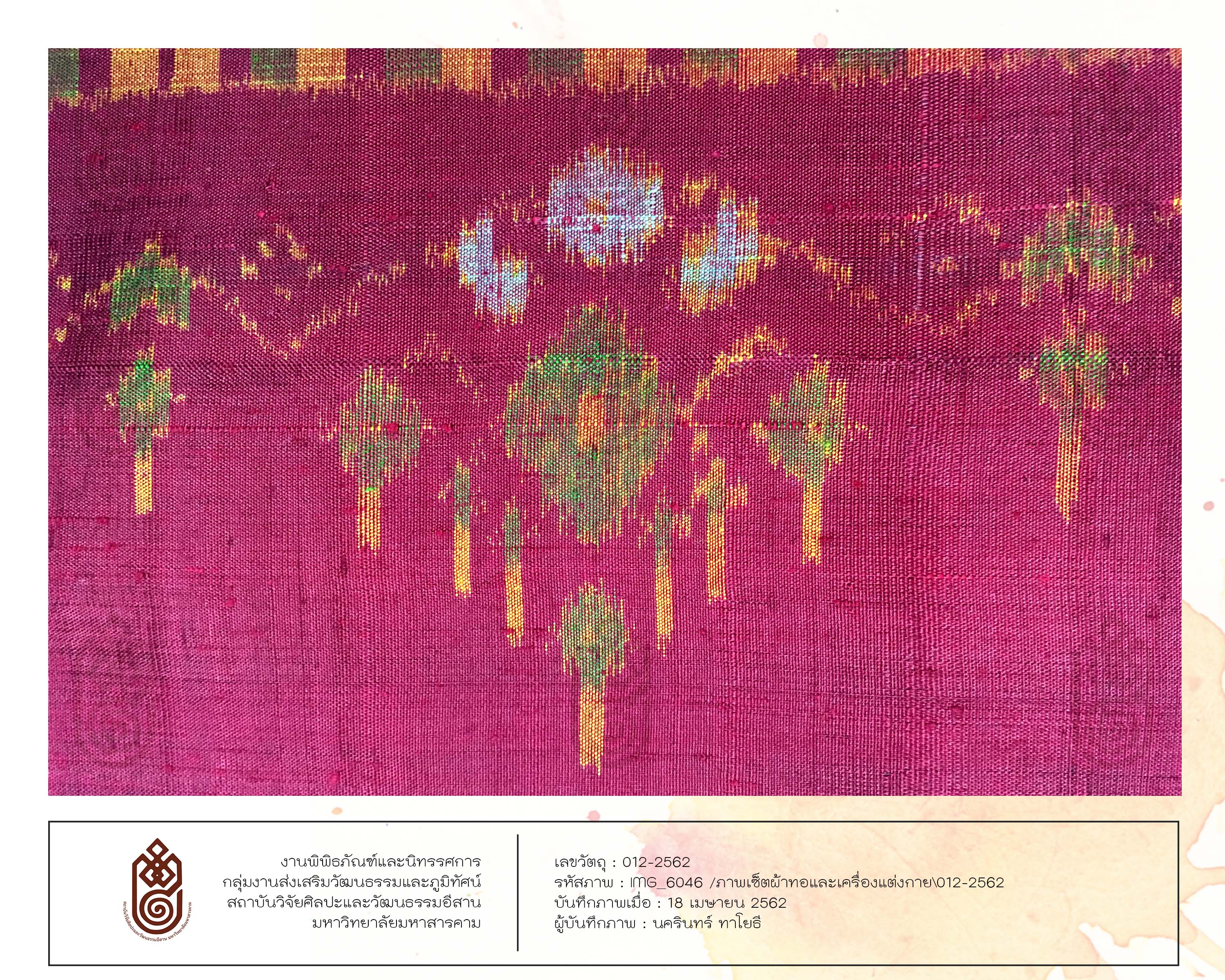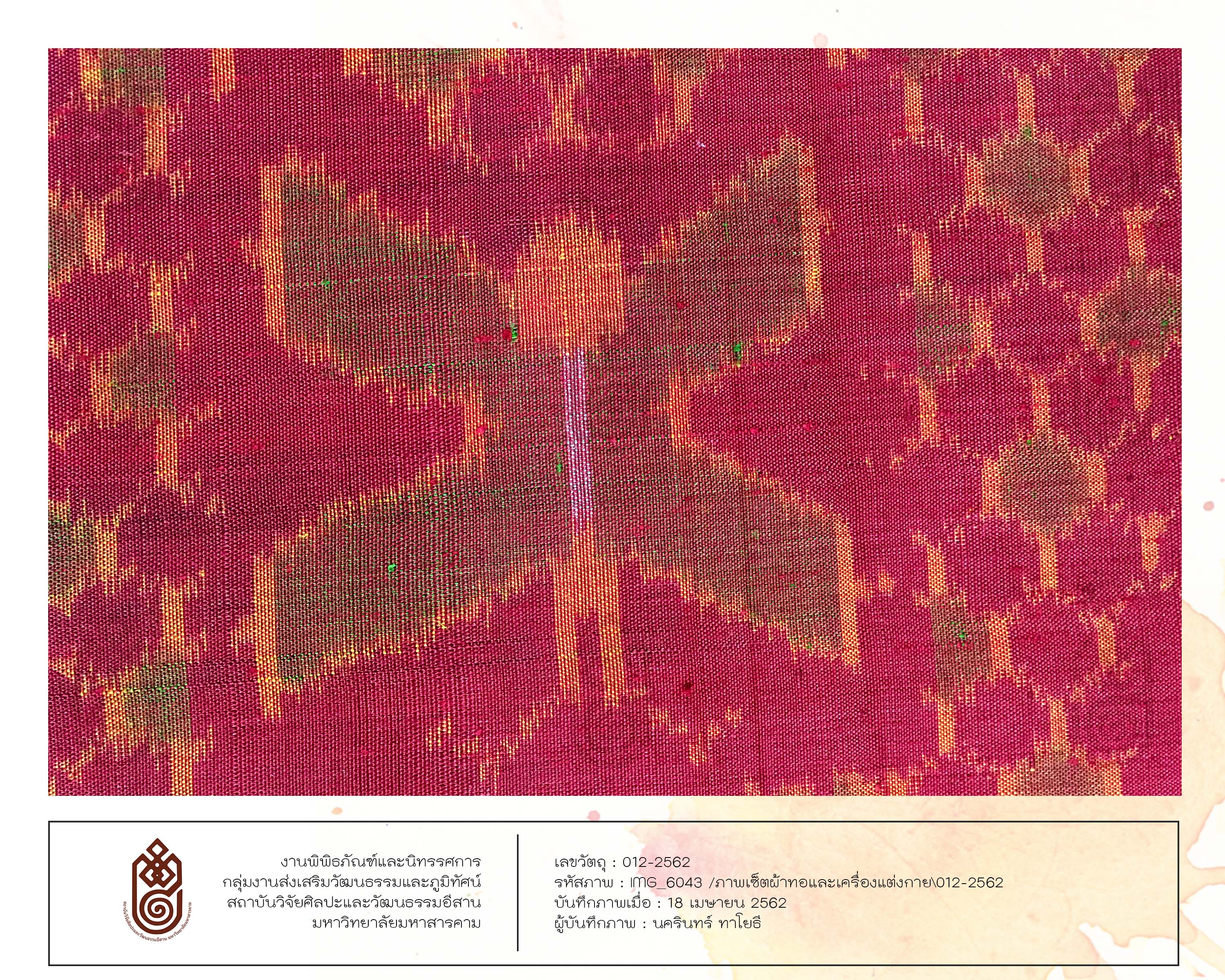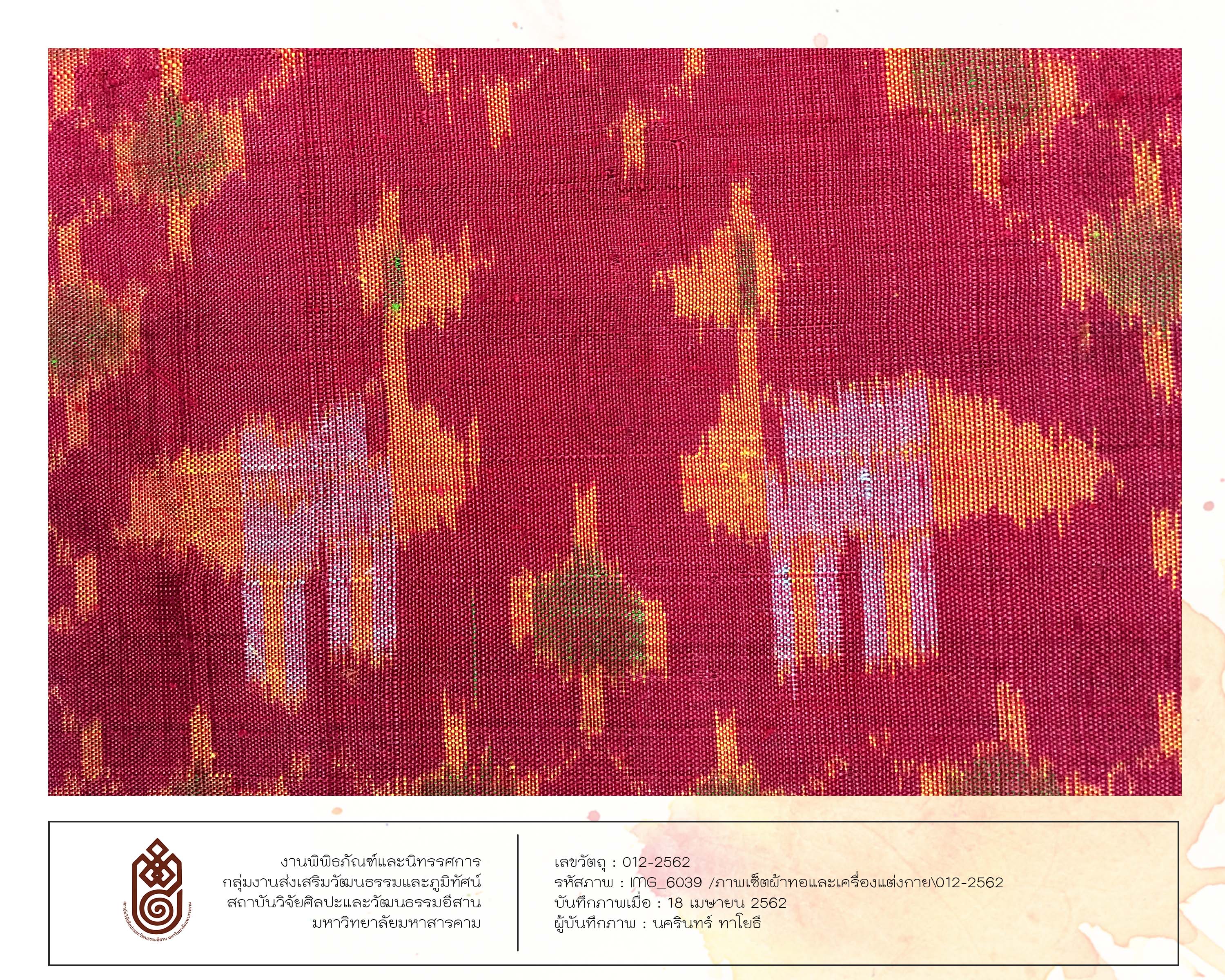 ลักษณะรูปร่างสี่เหลี่ยมผืนผ้า เป็นผ้าทอผืนยาวผืนเดียว เทคนิคที่ใช้ในการทอคือการมัดหมี่ทำให้เกิดลวดลาย สีพื้นของผ้าคือสีแดงย้อมจากสีเคมี ลวดลายประกอบด้วยลายประยุกต์ขึ้นมาจากจินตนาการของช่างผู้ทอ เป็นรูปนกสีเขียว สีเหลือง สีฟ้า สลับกับลายเกล็ดปลาสีเขียว สีเ