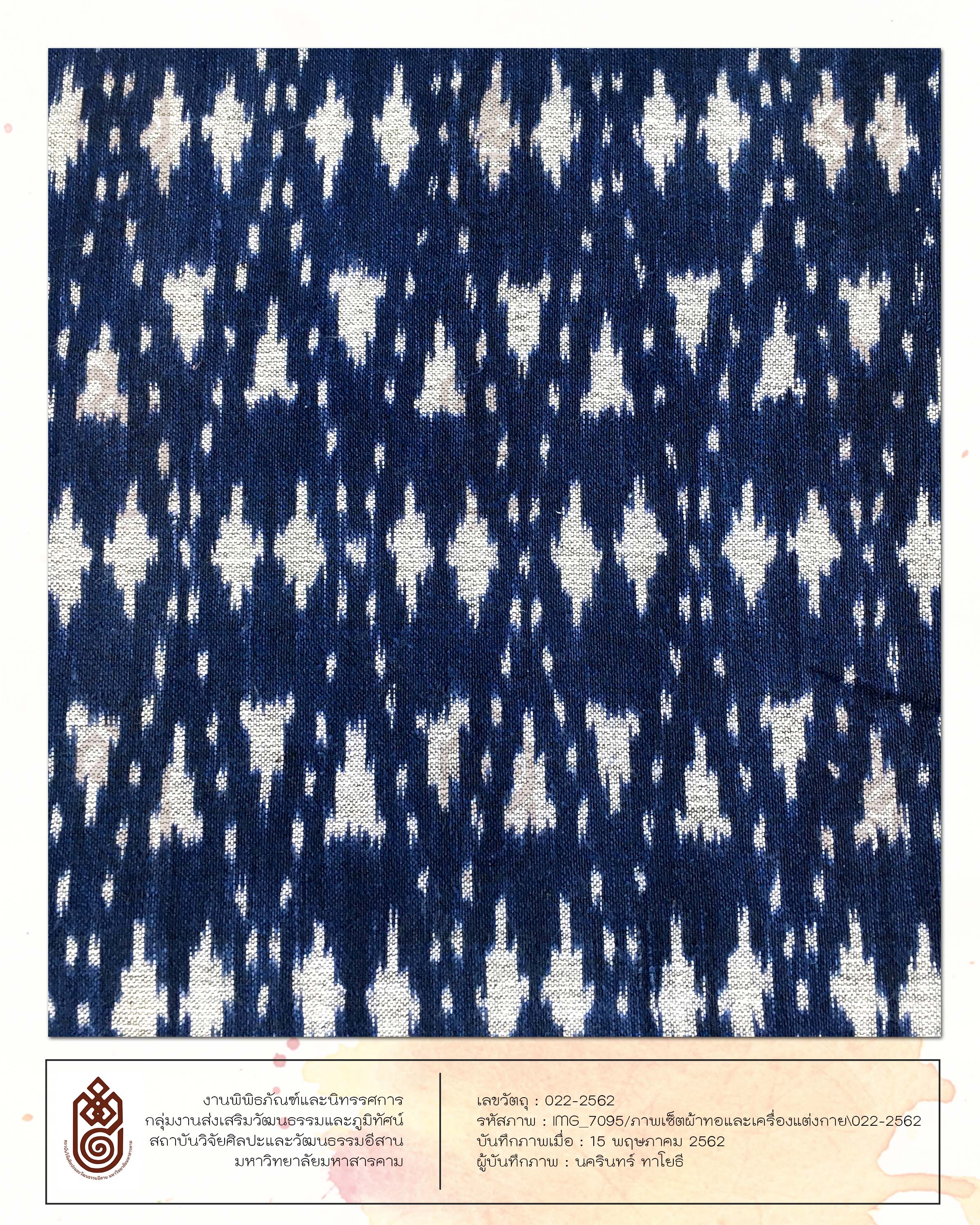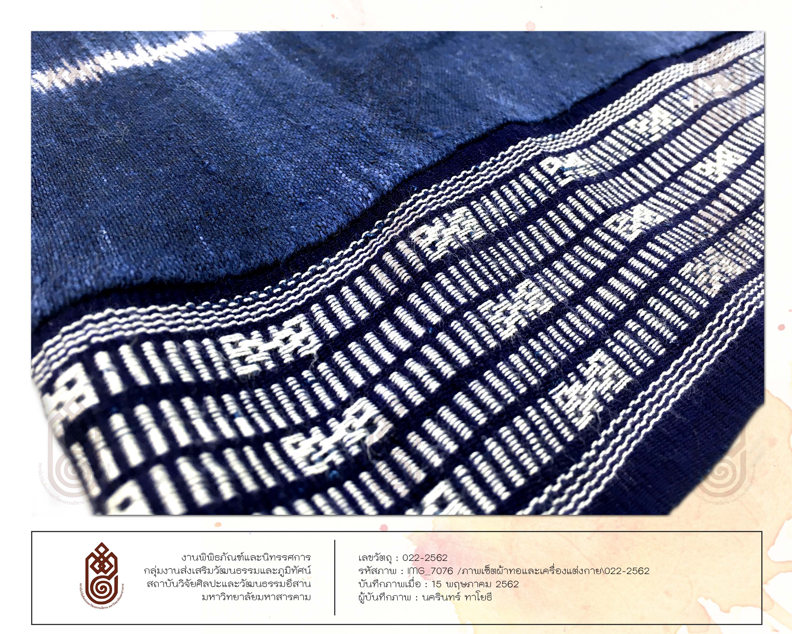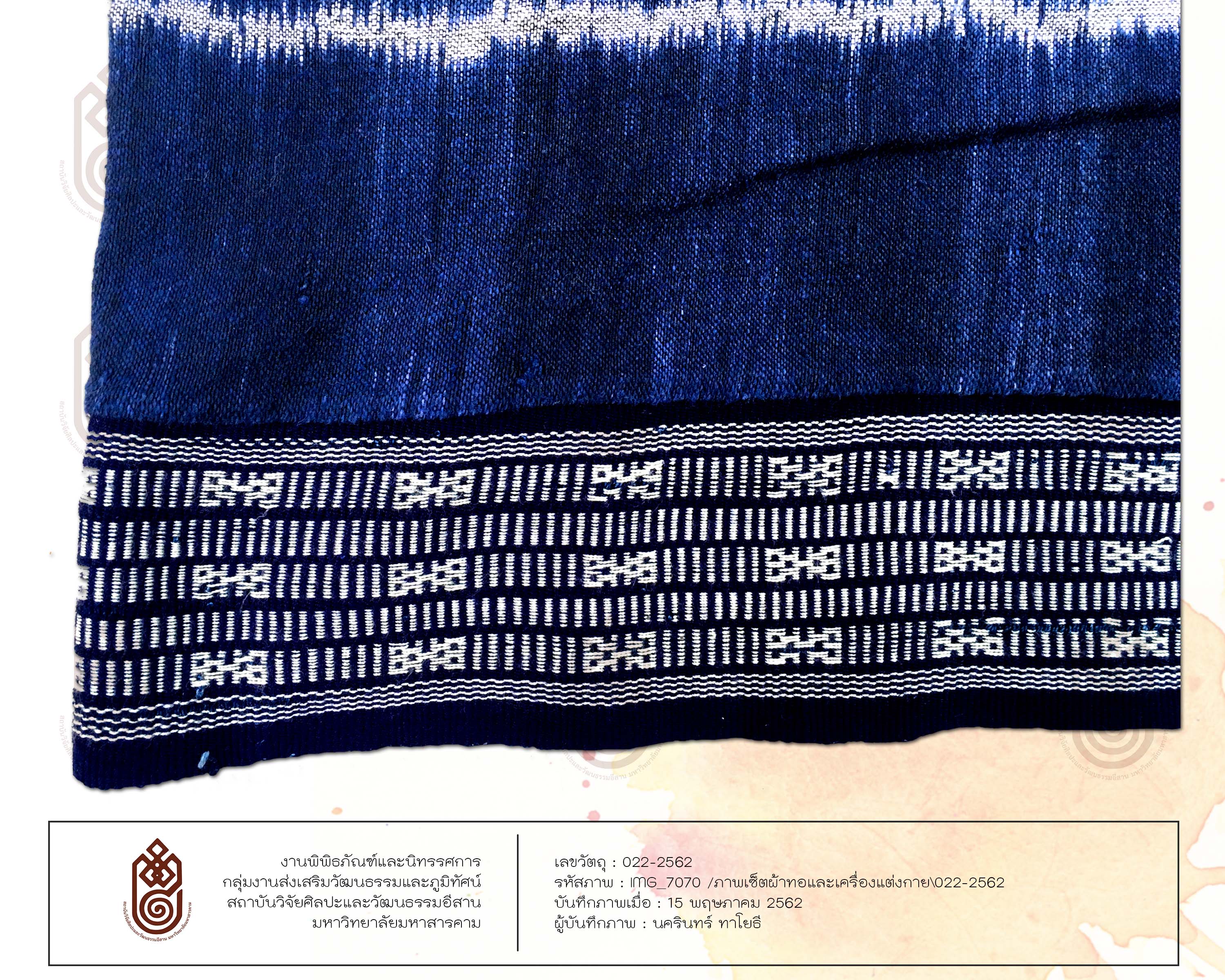 <p>ลักษณะรูปร่างสี่เหลี่ยมผืนผ้า เทคนิคการทอคือการใช้เส้นฝ้าย มัดหมี่ มีการเย็บเป็นผ้าซิ่น เป็นผ้าทอที่มีการต่อตีนซิ่น เป็นหมี่โคม 3 ลายสีขาว สีพื้นของผ้าคือสีน้ำเงินย้อมจากครามซึ่งเป็นการย้อมจากสีธรรมชาติ ตีนซิ่นเป็นการขิดทำให้เกิดลวดลายมีลายเครือแบดสีขาว</p>