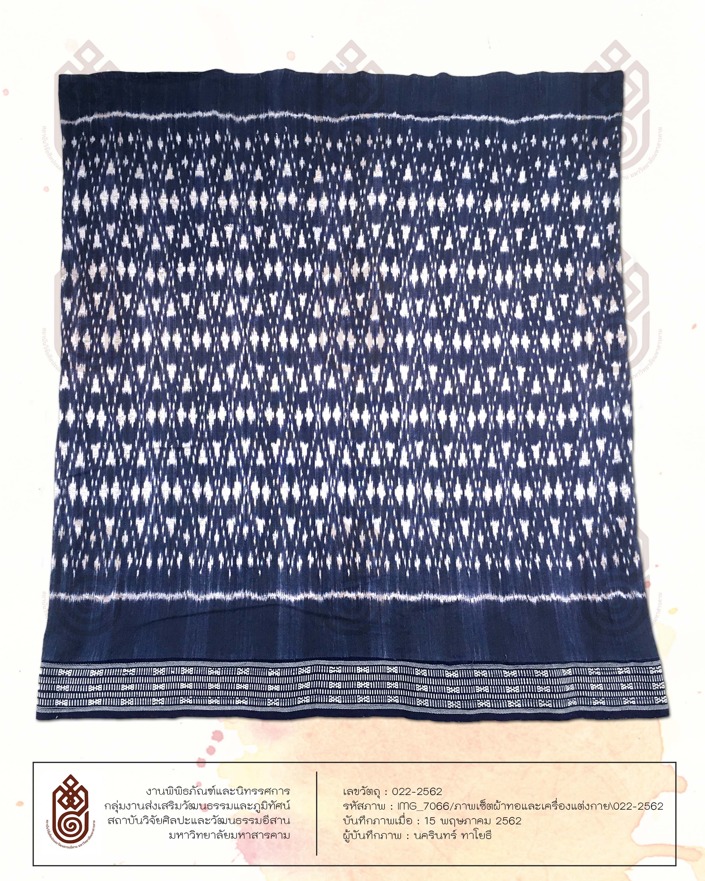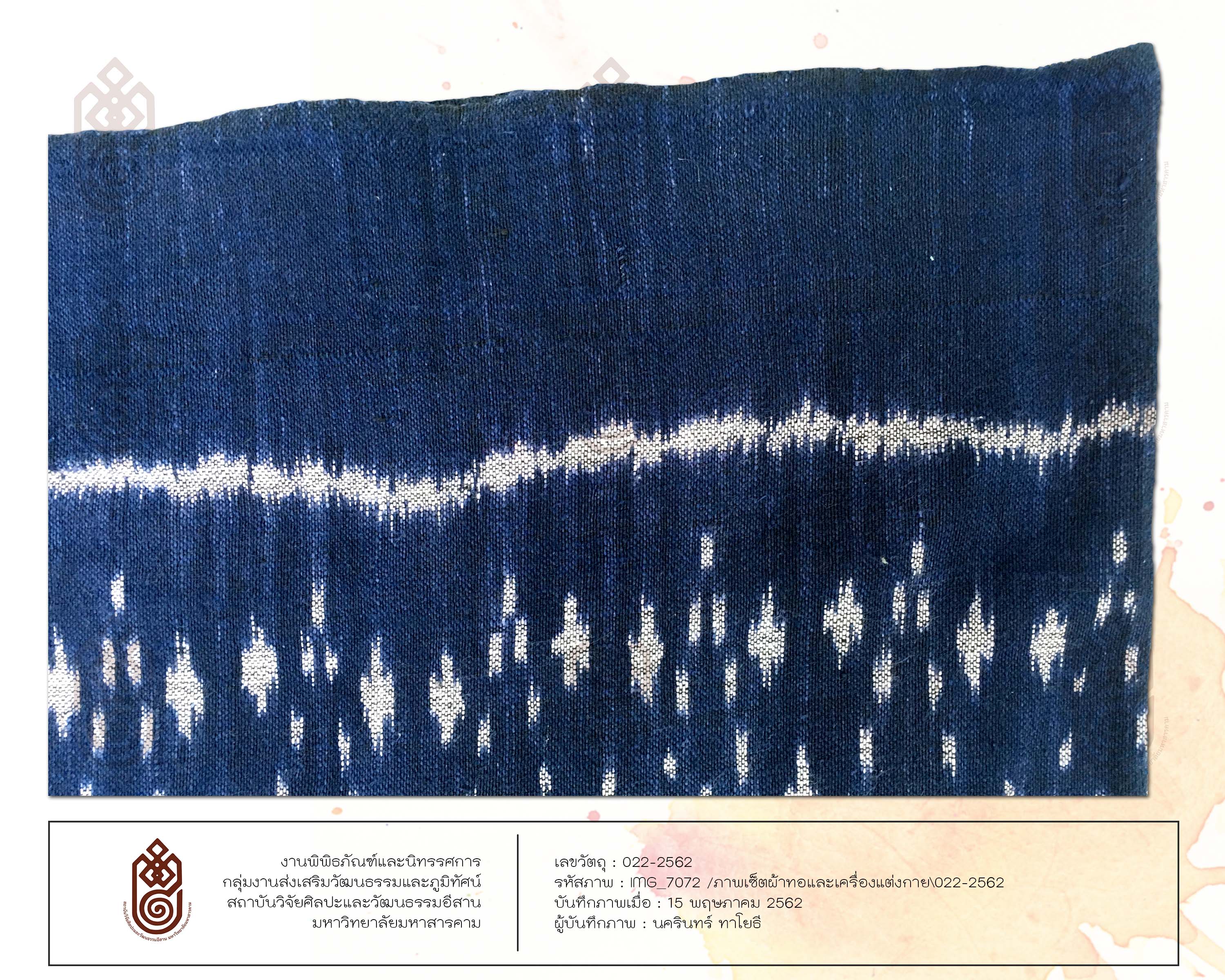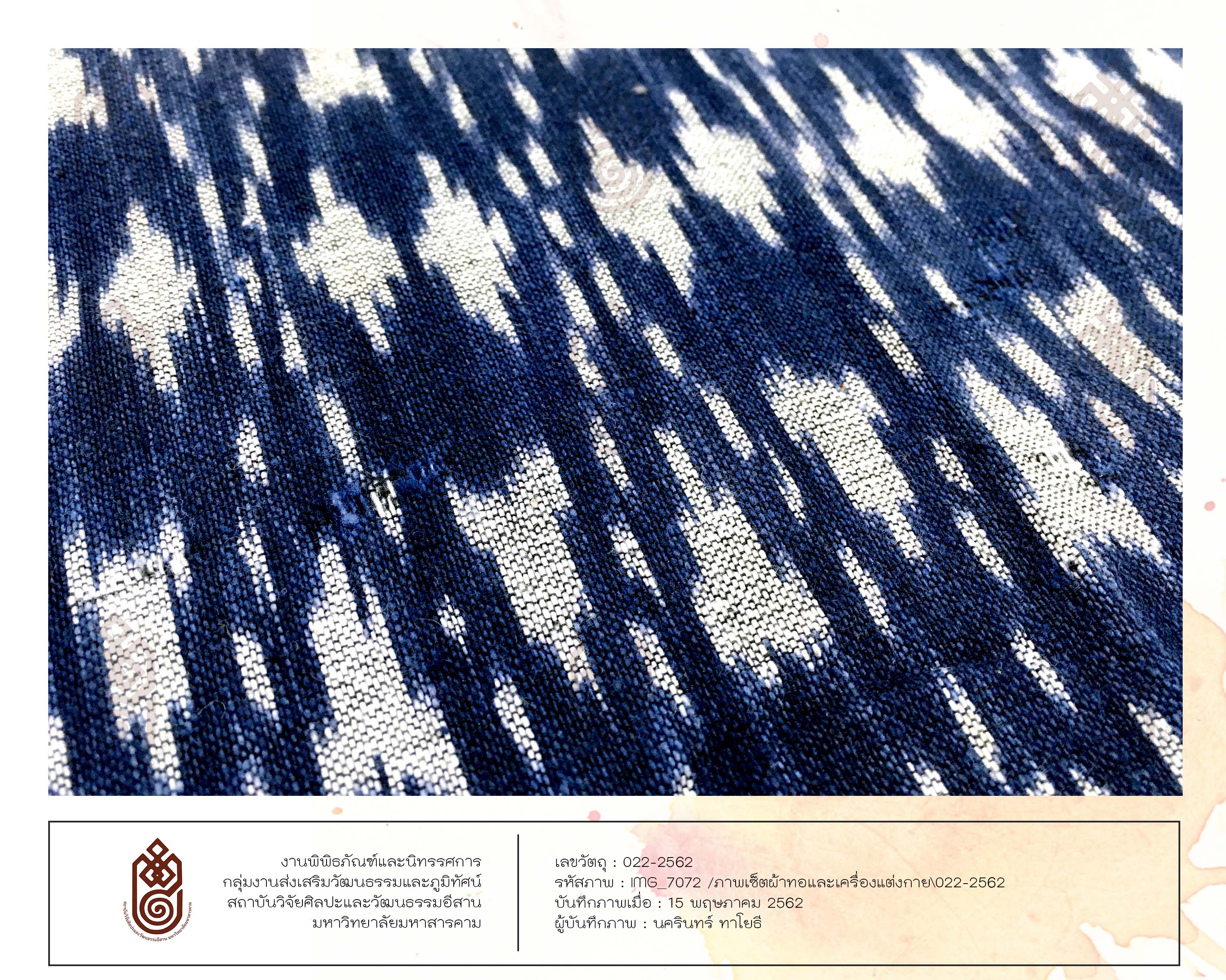 <p>ลักษณะรูปร่างสี่เหลี่ยมผืนผ้า เทคนิคการทอคือการใช้เส้นฝ้าย มัดหมี่ มีการเย็บเป็นผ้าซิ่น เป็นผ้าทอที่มีการต่อตีนซิ่น เป็นหมี่โคม 3 ลายสีขาว สีพื้นของผ้าคือสีน้ำเงินย้อมจากครามซึ่งเป็นการย้อมจากสีธรรมชาติ ตีนซิ่นเป็นการขิดทำให้เกิดลวดลายมีลายเครือแบดสีขาว</p>
