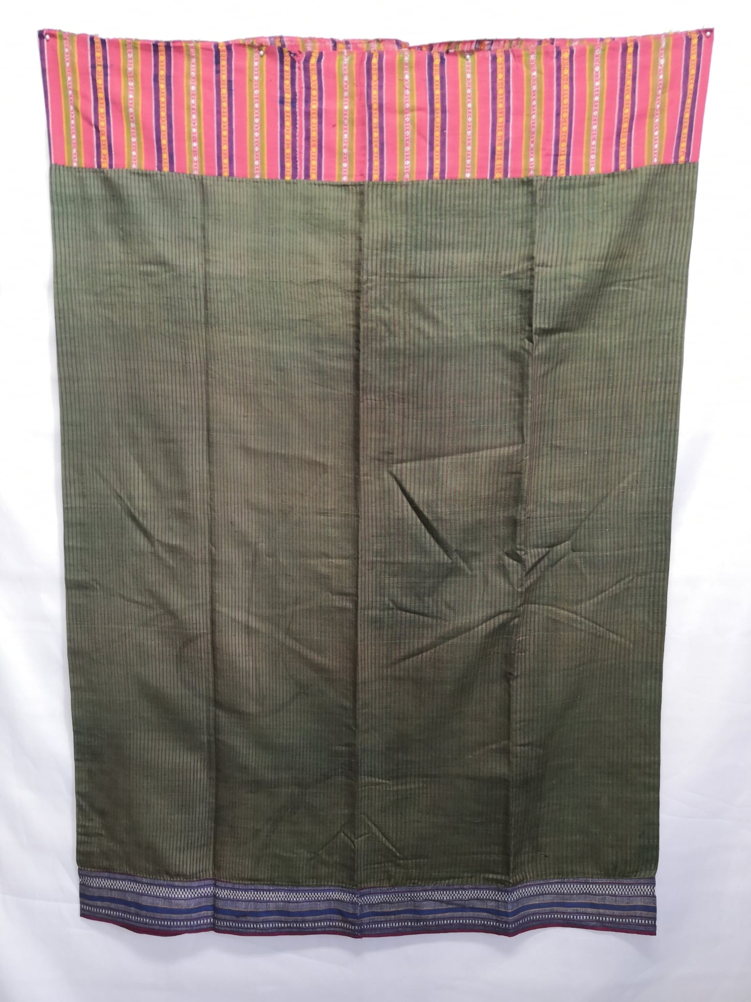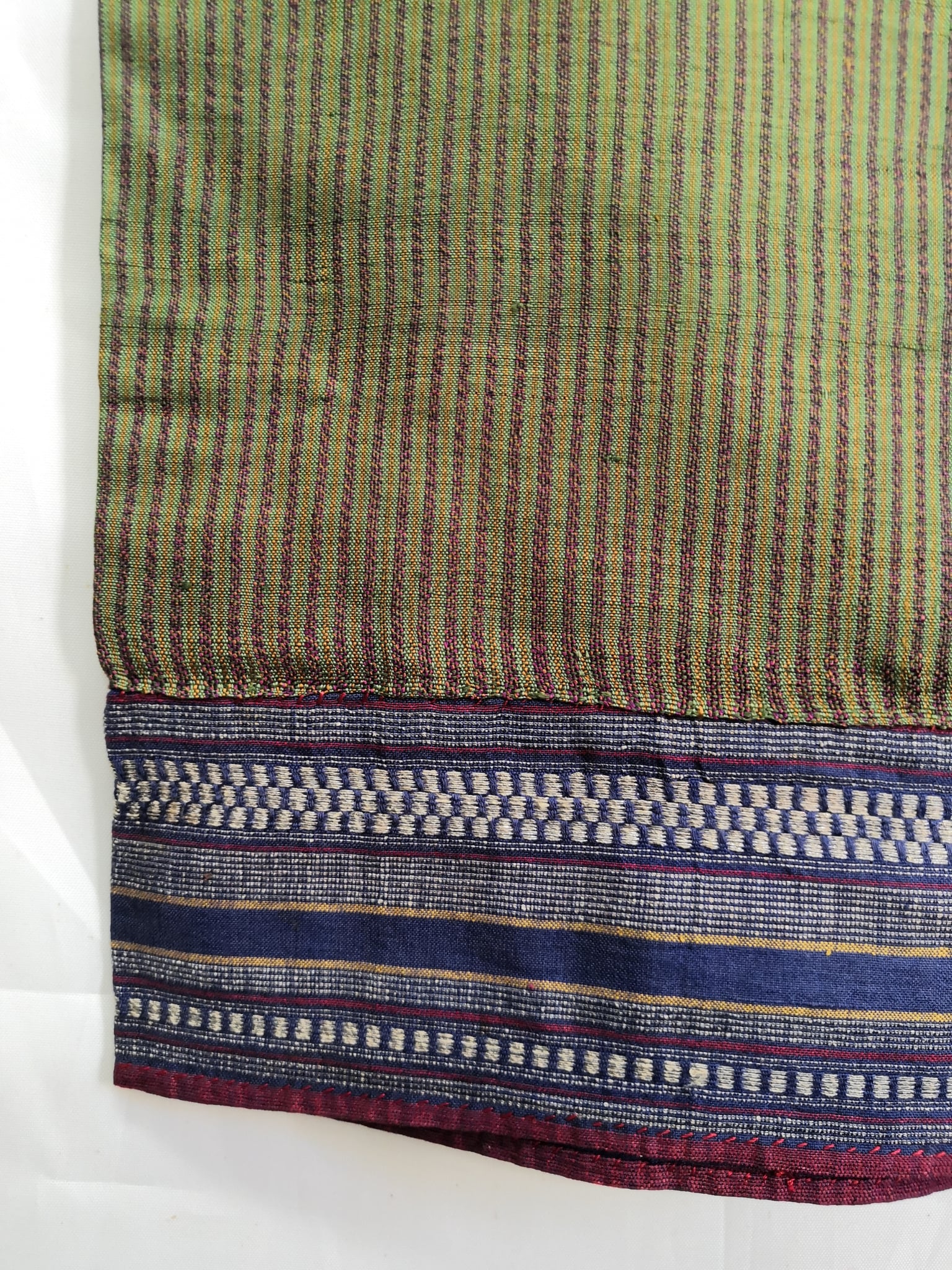 ผ้าซิ่มไหมคั่นเข็น ต่อหัวซิ่นขิดลายเต่าน้อย ต่อตีนแบบตำแหนะผสมดิ้นเงิน ทอด้วยเทคนิคการควบเส้น โดยใช้สีพื้นสีเขียวทอสลับเส้นควบ(สีแดง ดำ)