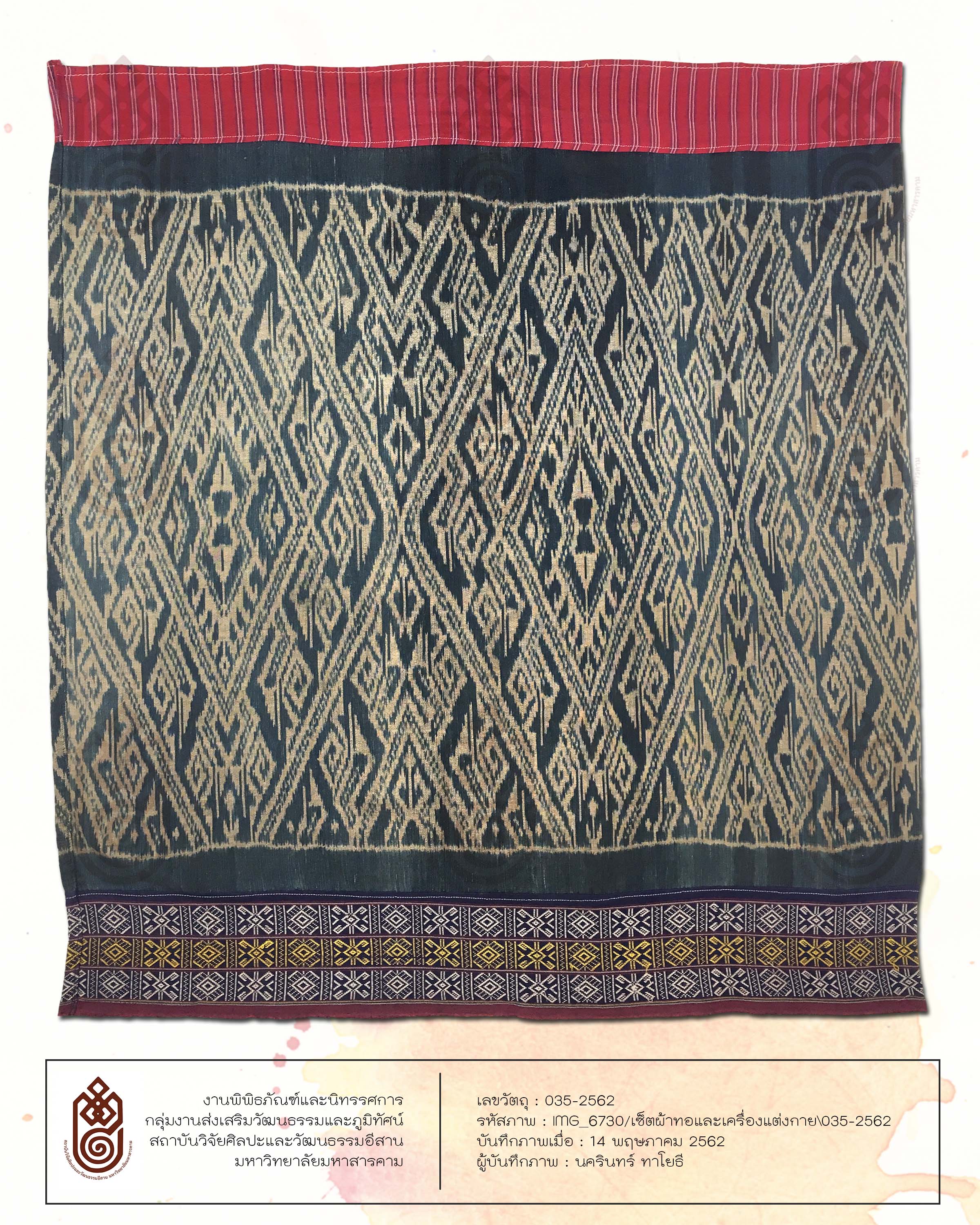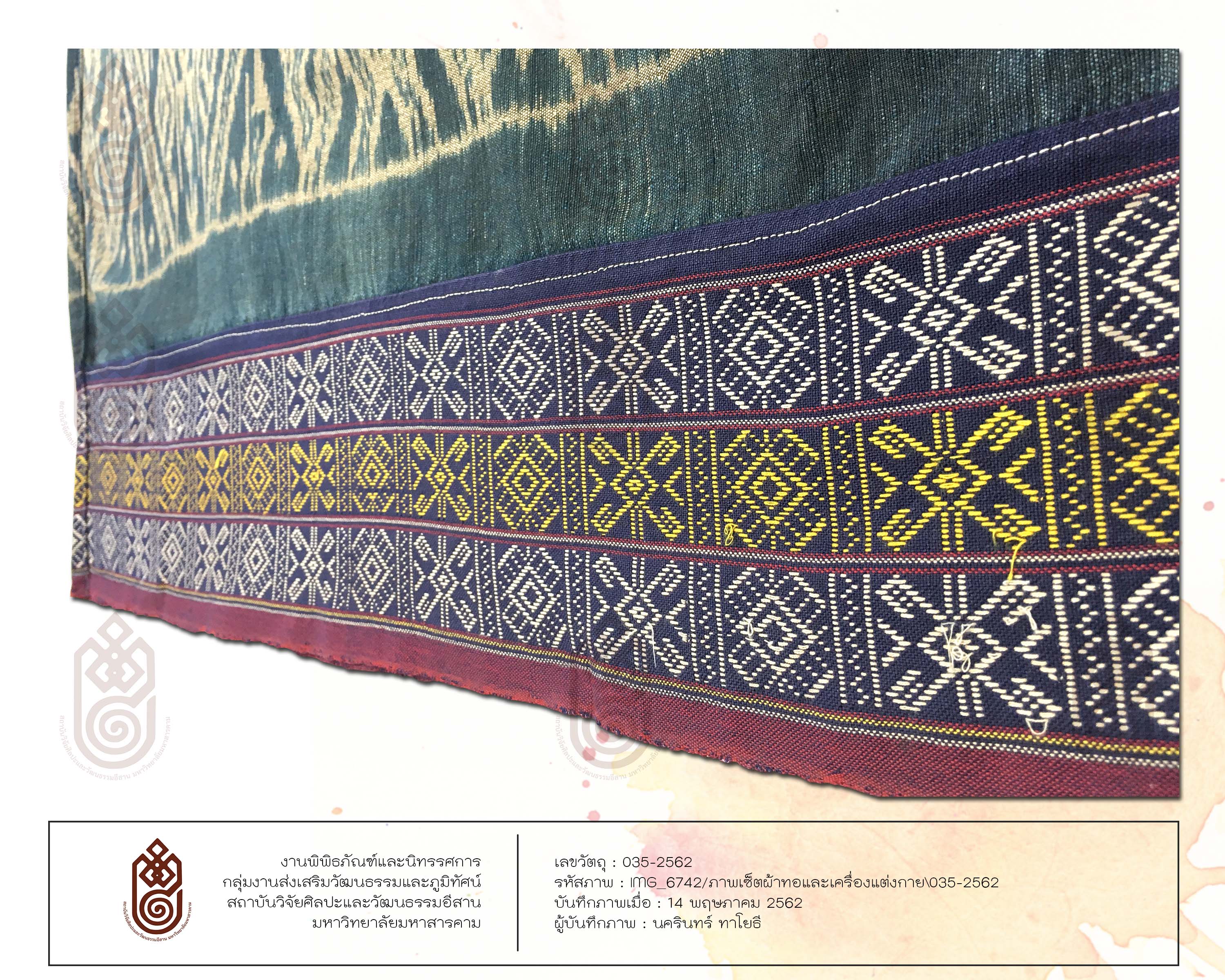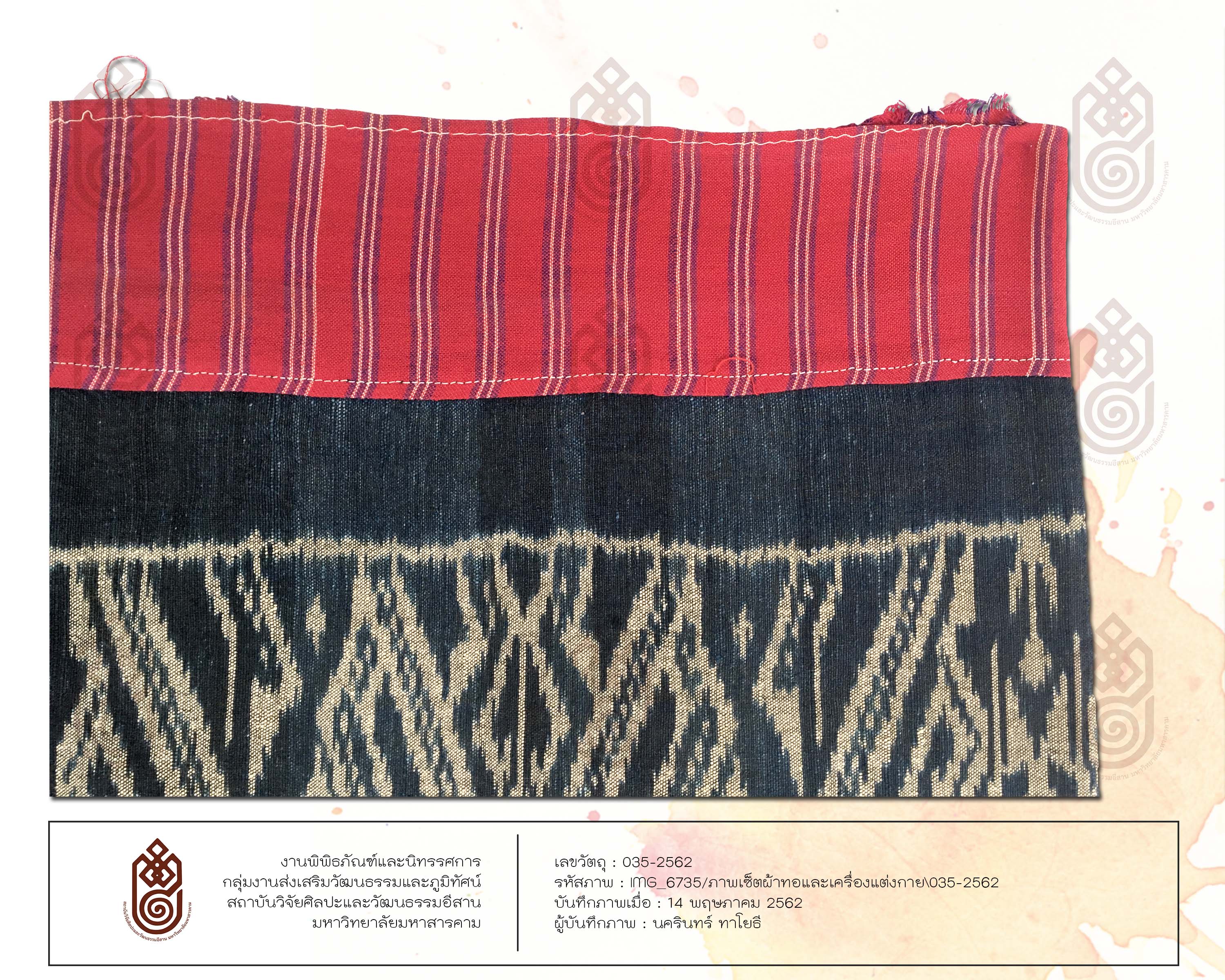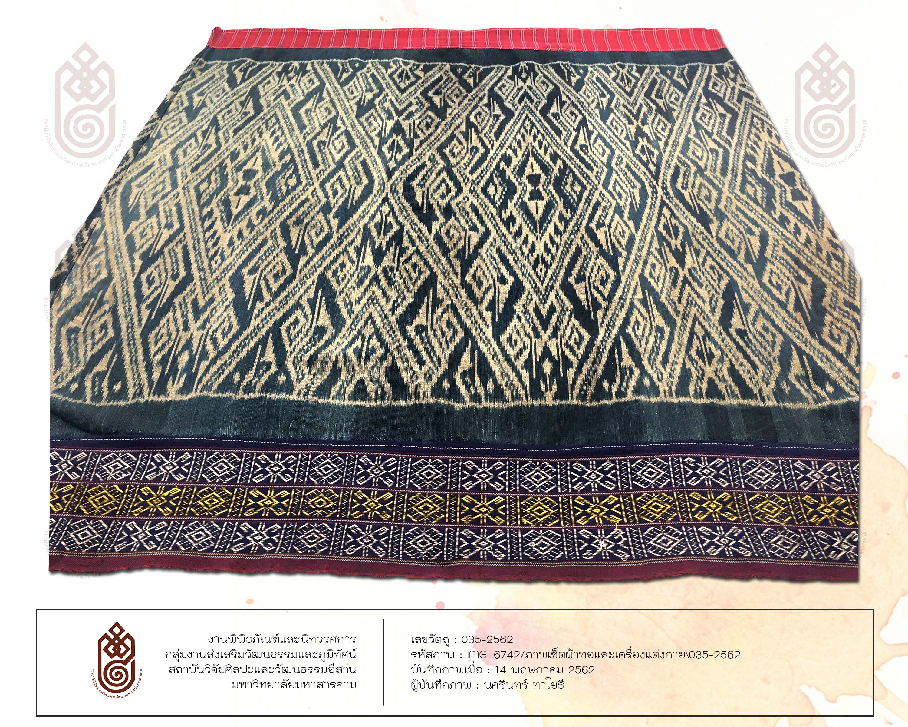 ลักษณะรูปร่างสี่เหลี่ยมผืนผ้า มีการเย็บเป็นผ้าซิ่น เป็นผ้าฝ้ายย้อมครามสีดำ เทคนิคที่ใช้ในการทอคือการมัดหมี่ทำให้เกิดลวดลาย คือลายนาคคอคด สีเหลือง มีการต่อหัวสีแดงลายคั่น ต่อตีนสีน้ำเงิน สีแดง ประกอบด้วยลายขอยืนสีขาว สีเหลือง