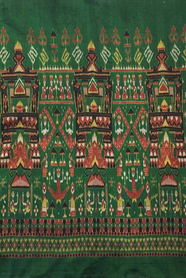 ลักษณะรูปร่างสี่เหลี่ยมผืนผ้า เป็นผ้าทอผืนยาวผืนเดียว เทคนิคที่ใช้ในการทอคือการใช้เส้นไหมมัดหมี่ 2 หัว สีพื้นคือสีเขียว เป็นผ้าเผวด ประกอบด้วยลายประตูโขงสีดำ สีแดง สีเหลือง สีขาว