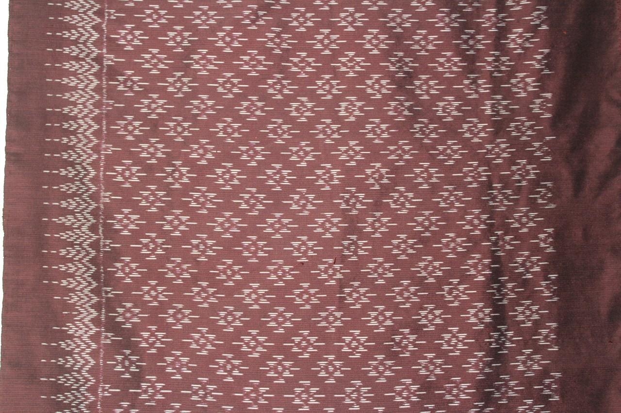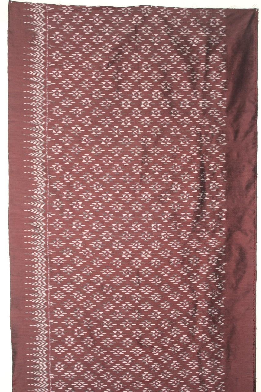 มีรูปร่างสี่เหลี่ยมผืนผ้า มัดลายหมี่สีขาว ย้อมสีน้ำตาลเข้ม เชิงผ้าลายต้นสน