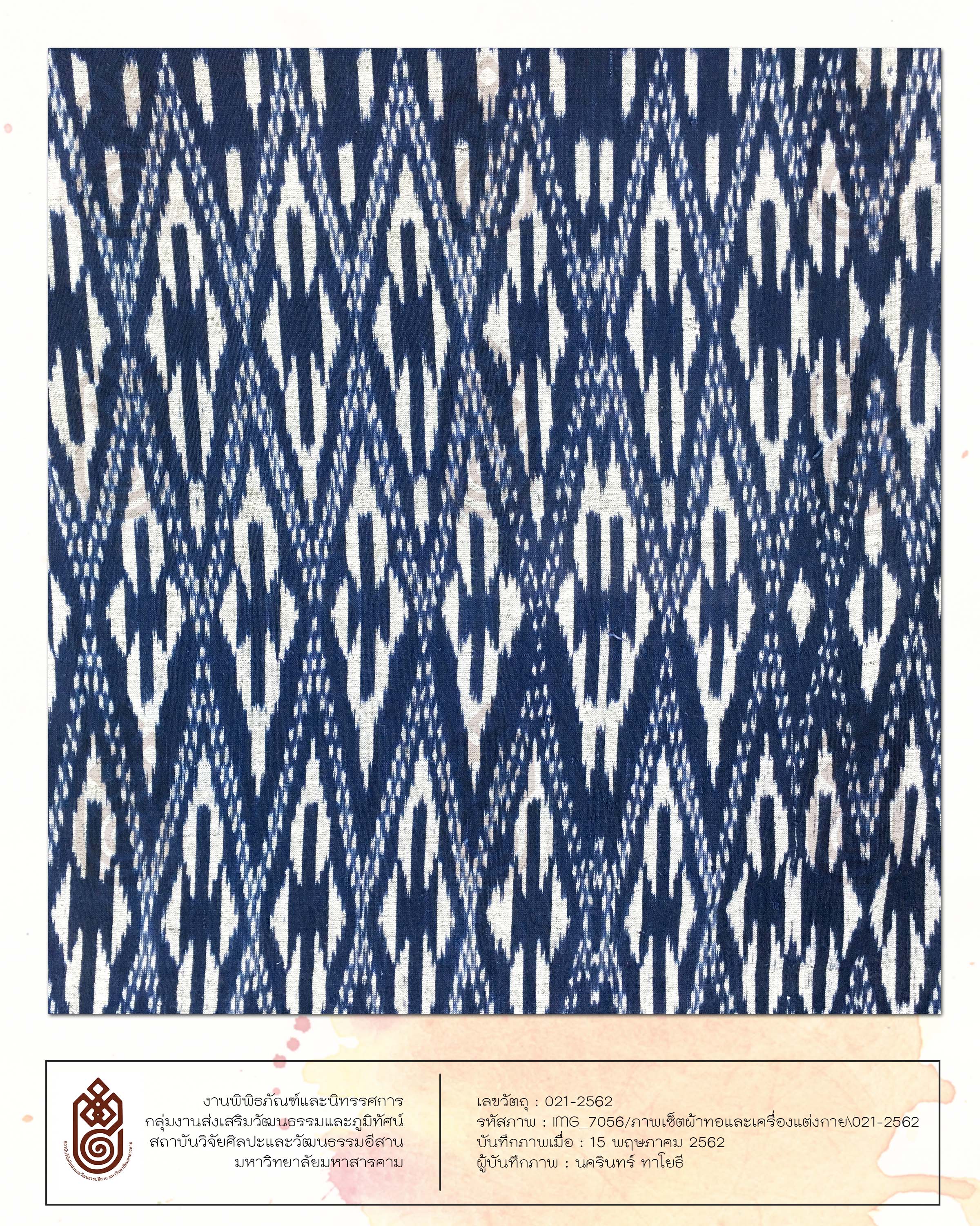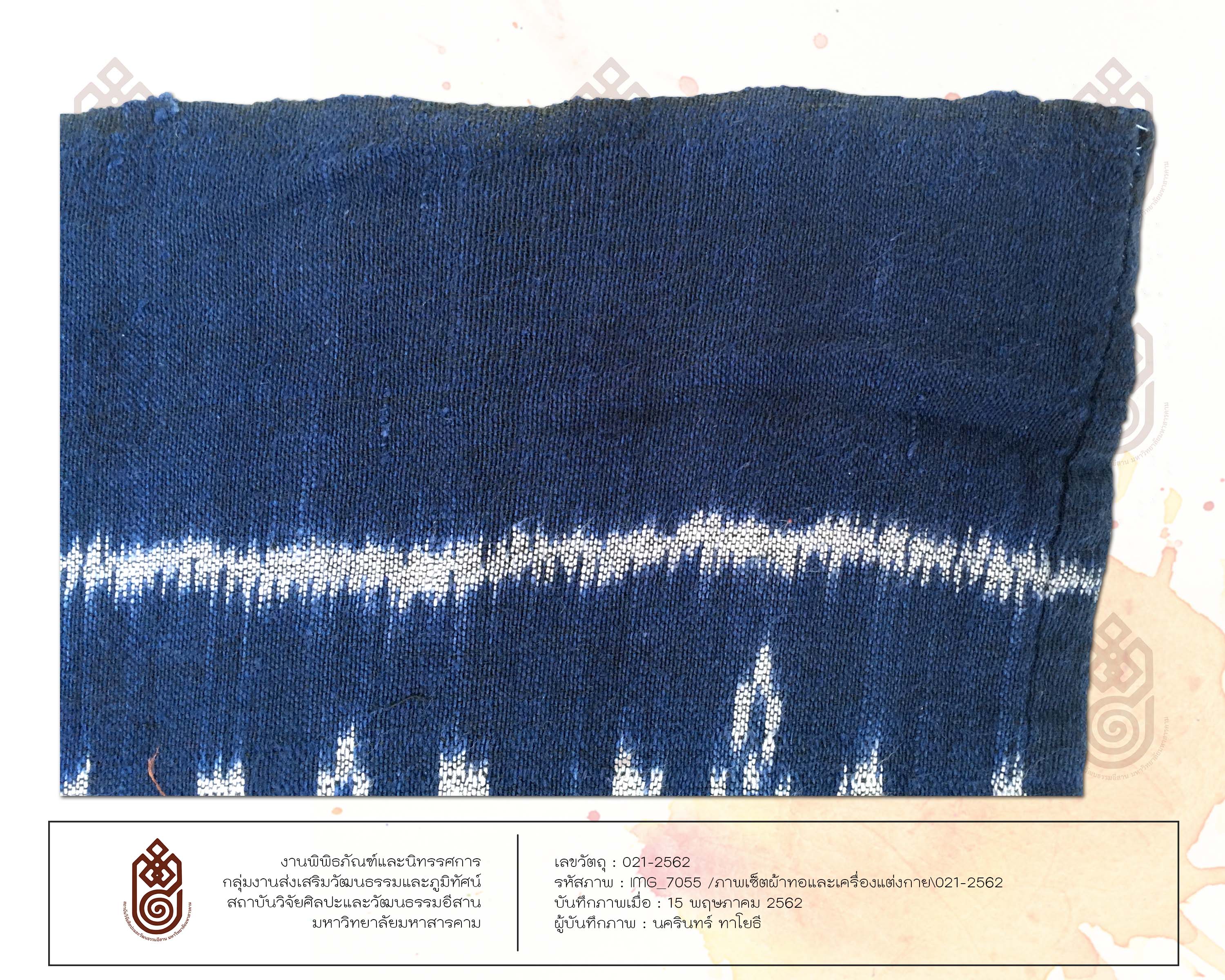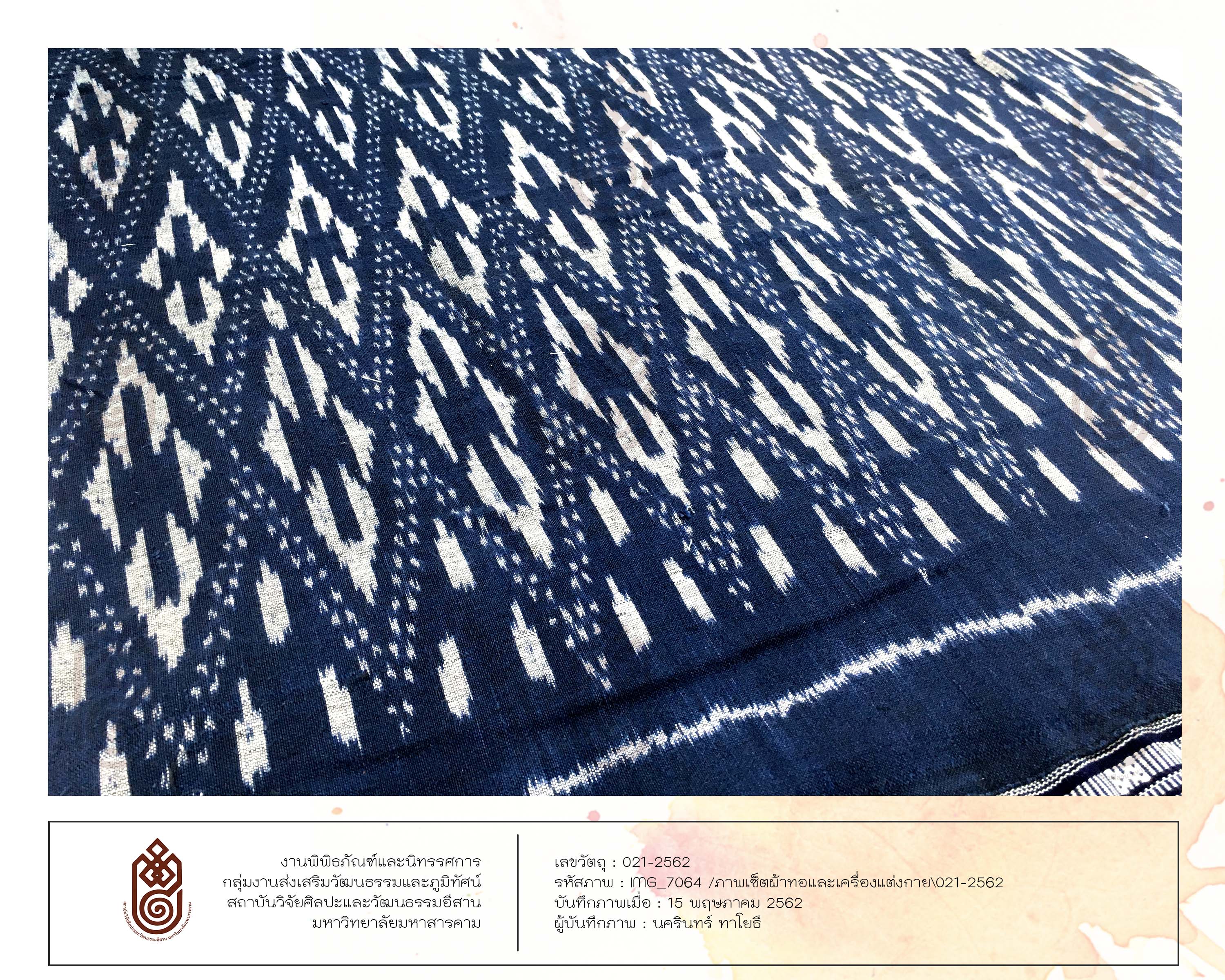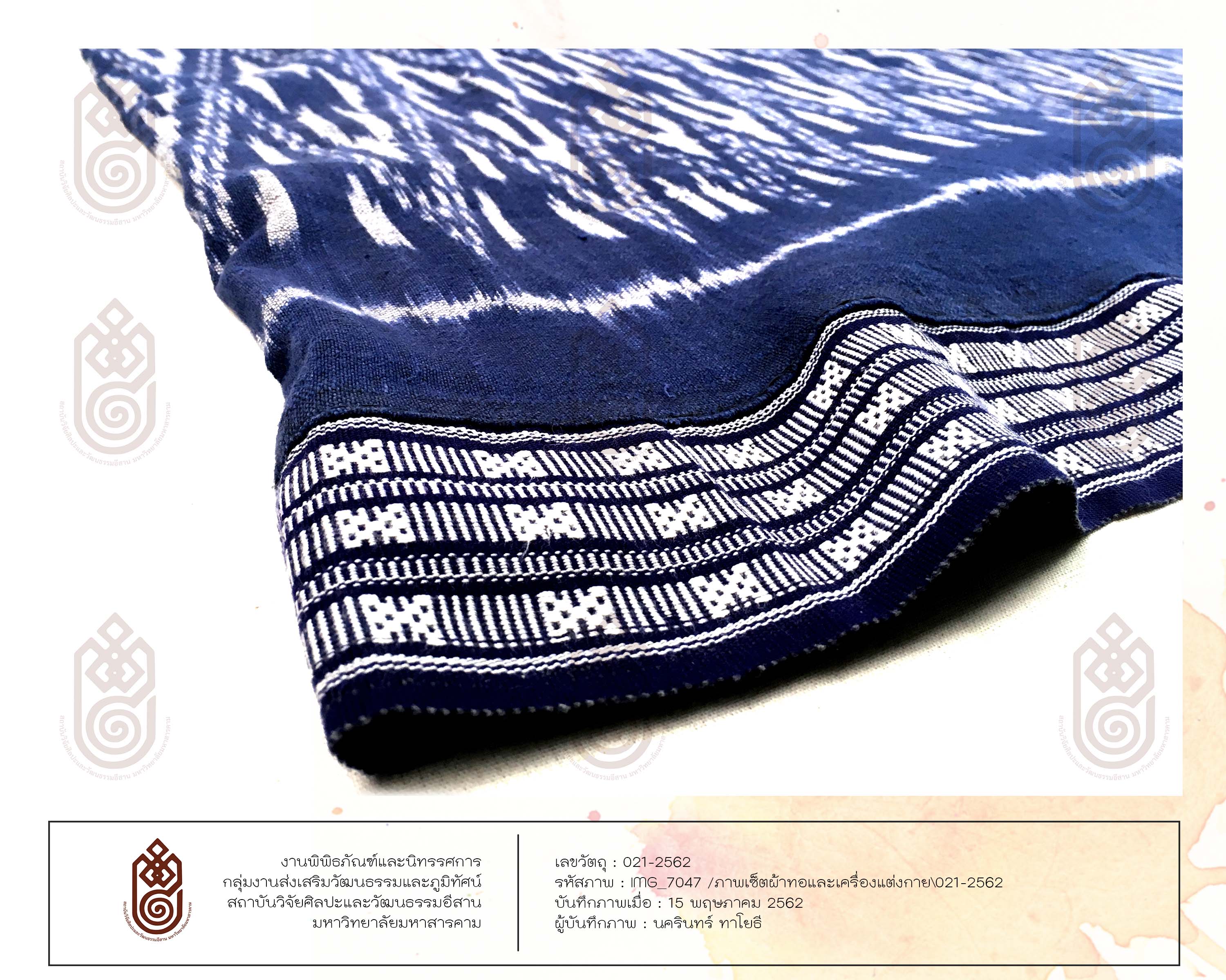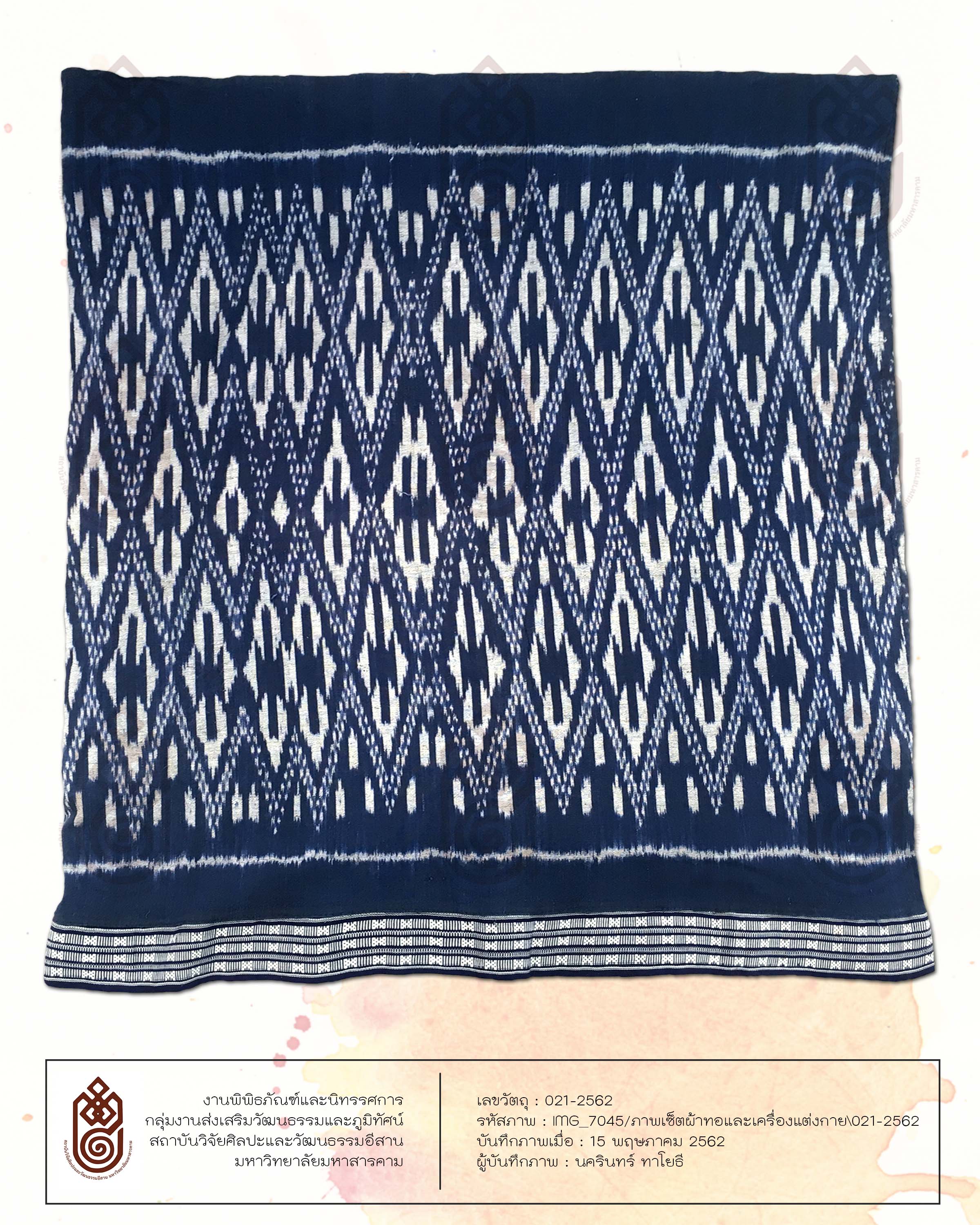 ลักษณะรูปร่างสี่เหลี่ยมผืนผ้า เทคนิคการทอคือการใช้เส้นฝ้าย มัดหมี่ มีการเย็บเป็นผ้าซิ่น เป็นผ้าทอที่มีการต่อตีนซิ่น ลวดลายประกอบด้วยลายพันธุ์ไม้ สีขาว โคม 5 สีพื้นของผ้าคือสีน้ำเงินย้อมจากครามซึ่งเป็นการย้อมจากสีธรรมชาติ ตีนซิ่นเป็นการขิดทำให้เกิดลวดลาย
